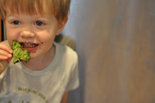 I'm constantly trying to get more green stuff in my little people and Eric, though I didn't even bother asking Eric to try these. He came into the kitchen asking "why are you making broccoli cookies???" after smelling my experiment with agave nectar, cocoa powder, and cinnamon on a batch (not good - I do NOT recommend trying that). Salt, however, was good.